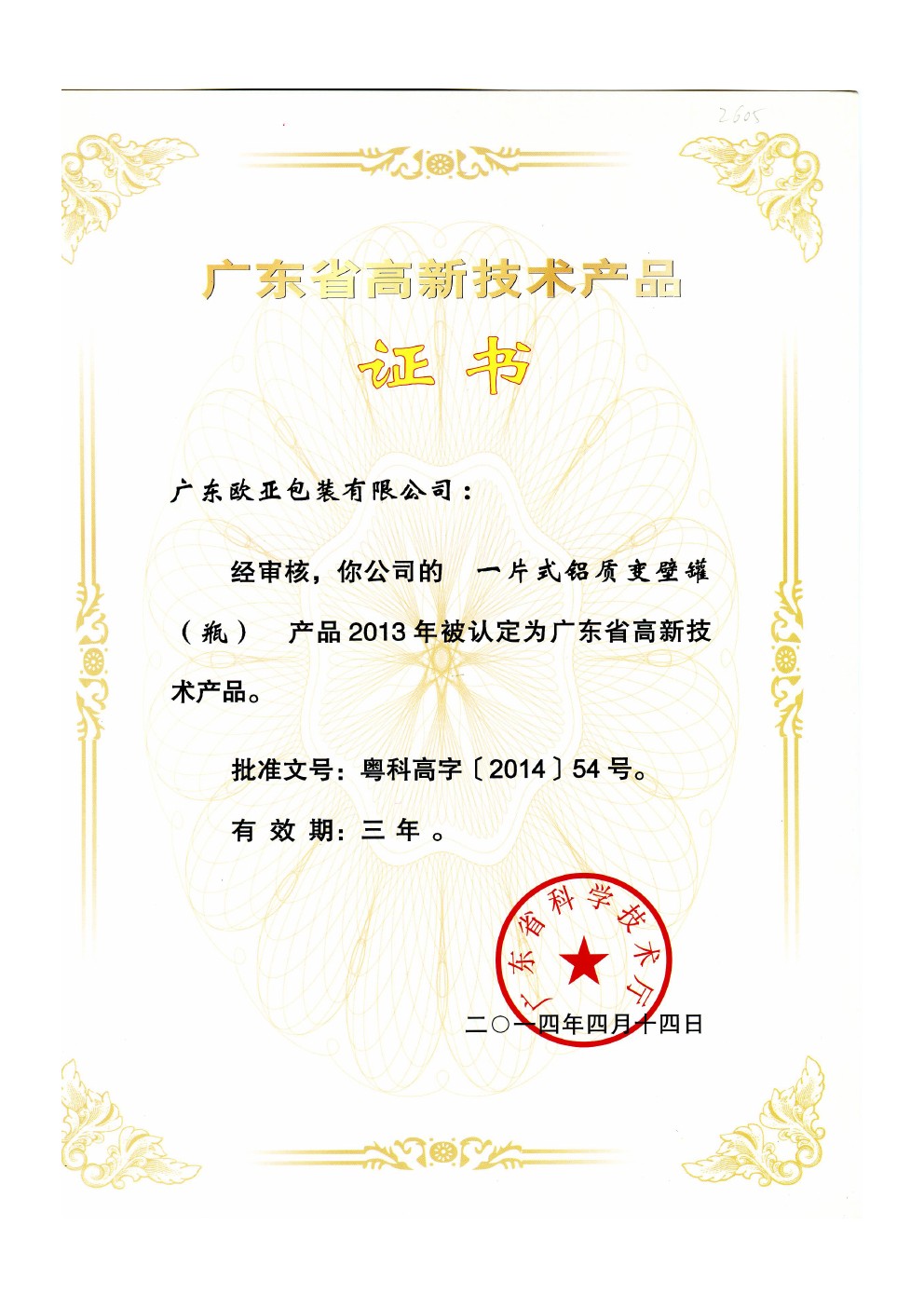 高新技术产品证书